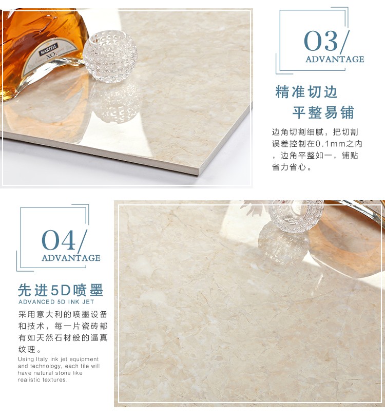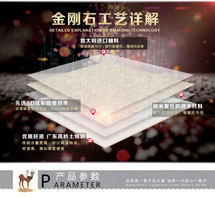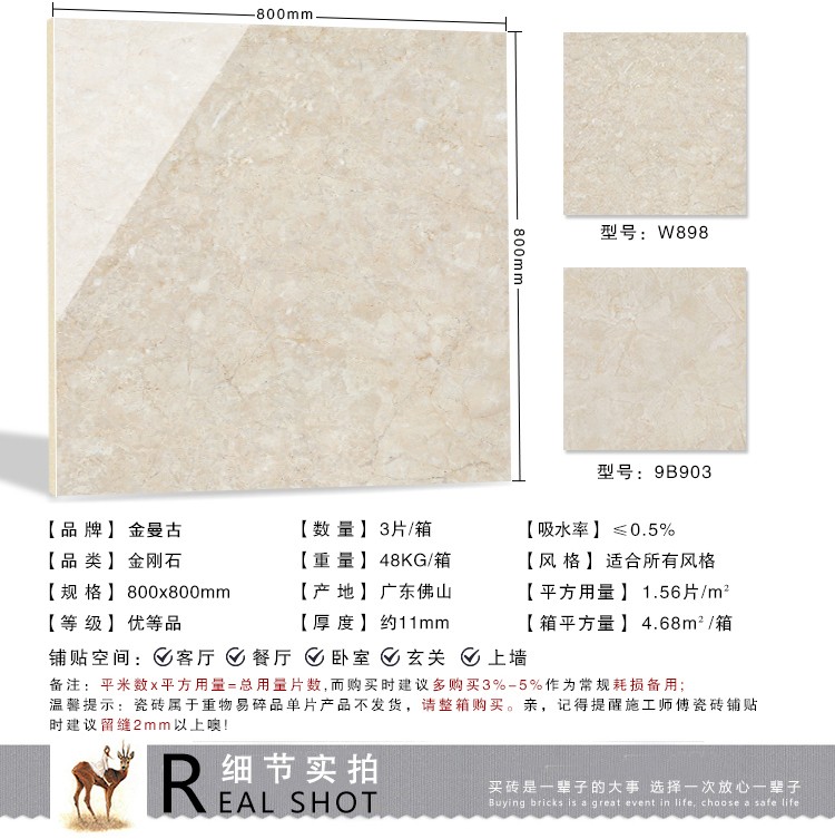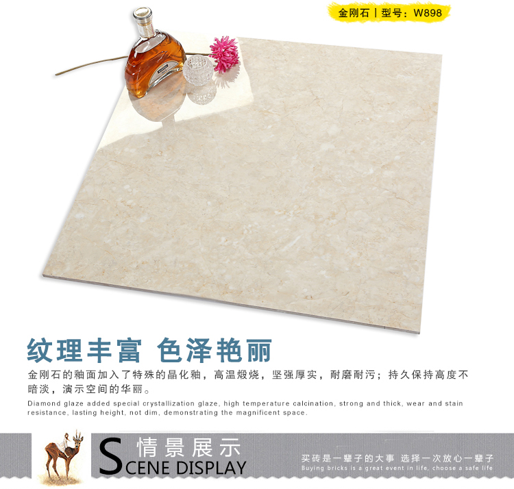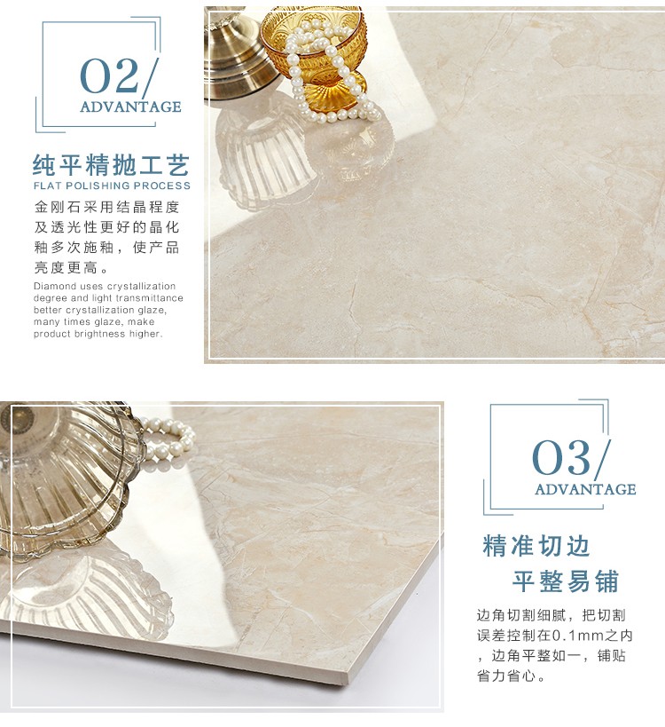 金曼古瓷磚廠家特價(jià)金剛石因高品質(zhì)而得名,是一款極具天然石材效果和微晶石質(zhì)感的仿石材瓷磚,它不但在價(jià)格、環(huán)保、耐用和清潔上極具優(yōu)勢(shì),在質(zhì)感、規(guī)格、花色、重量等指標(biāo)上,金剛石都遠(yuǎn)遠(yuǎn)勝于石材、拋光磚。相比其他種類的產(chǎn)品,它最大的特點(diǎn)可以用“高亮度、高耐磨、高平整、高逼真、高清晰、高環(huán)保”。