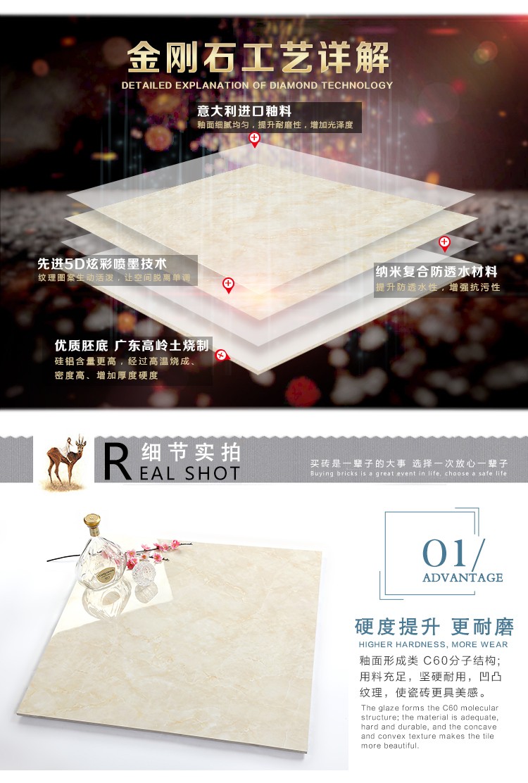 金曼古全拋釉瓷磚運用多層特殊制造工藝,將全透析釉料下彩技術結合先進印刷工藝,令花紋俯在下層,低碳能源、清潔生產,表面光潔剔透,獨有釉料精拋工序,集拋光磚與仿古磚優(yōu)點于一體,釉面如拋光磚般光滑亮潔,同時其釉面花色如仿古磚般圖案豐富,色彩厚重或絢麗。