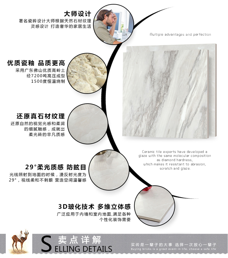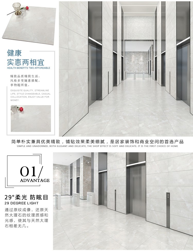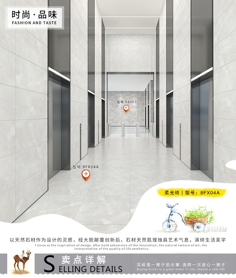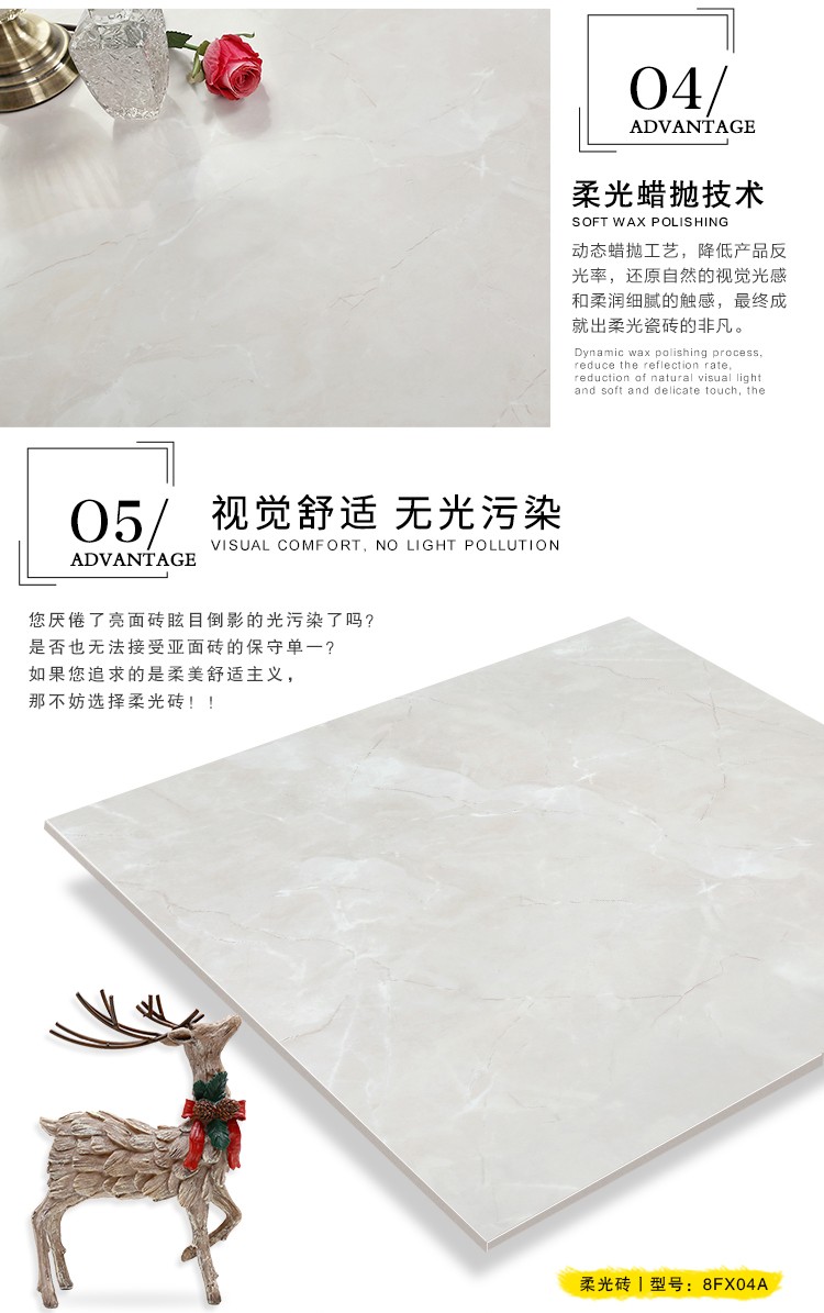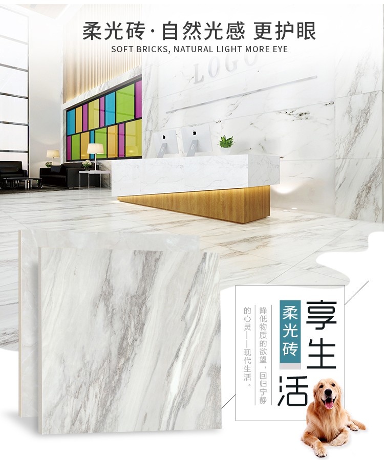柔光瓷磚是磚面反射介于強(qiáng)光與弱光之間的一類瓷磚,其結(jié)合亮光類瓷磚的高調(diào)明艷裝飾和啞光類瓷磚的低調(diào)內(nèi)斂搭配效果,通過動(dòng)態(tài)柔光蠟拋技術(shù),降低產(chǎn)品反光率,從而達(dá)到人體舒適的視覺感受以及無光污染的空間裝飾效果。優(yōu)點(diǎn):1.視覺舒適,無光污染 2.堅(jiān)固耐磨,不易刮花.