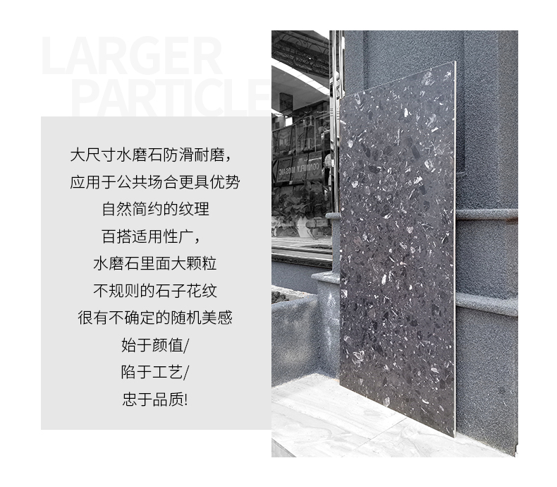 大尺寸水磨石防滑耐磨,應用于公共場合更具優勢,自然簡約的紋理,百搭適用性廣,水磨石里面大顆粒,不規則的石子花紋,很有不確定的隨機美感。始于顏值/陷于工藝/忠于品質!