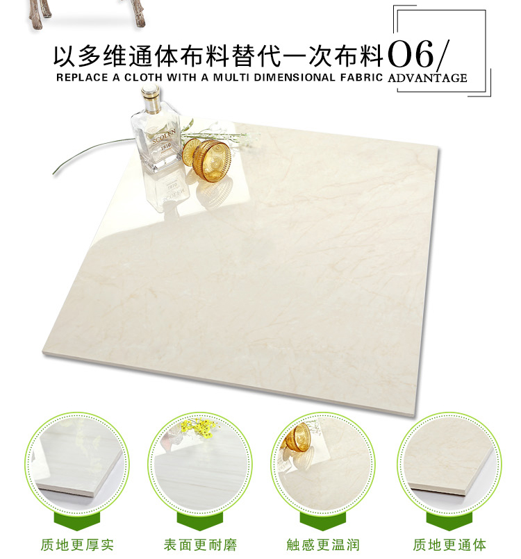 瓷拋磚,是陶瓷墻地磚的創(chuàng)新品類之一,其表面為瓷質(zhì)材料,經(jīng)印刷裝飾,高溫燒結(jié),表面拋光處理而成。與表面為玻璃質(zhì)材料的陶瓷墻地磚相比,具有更高的耐磨特性,質(zhì)感更加溫潤,紋理更加自然而逼真,適合各類建筑物的內(nèi)外墻地裝飾。