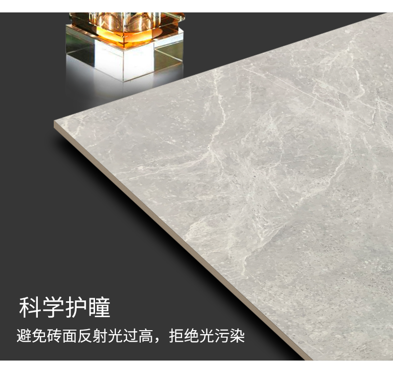 柔光瓷磚是磚面反射介于強光與弱光之間的一類瓷磚,其結(jié)合亮光類瓷磚的高調(diào)明艷裝飾和啞光類瓷磚的低調(diào)內(nèi)斂搭配效果,通過動態(tài)柔光蠟拋技術(shù),降低產(chǎn)品反光率,從而達到人體舒適的視覺感受以及無光污染的空間裝飾效果。優(yōu)點:1.視覺舒適,無光污染 2.堅固耐磨,不易刮花.