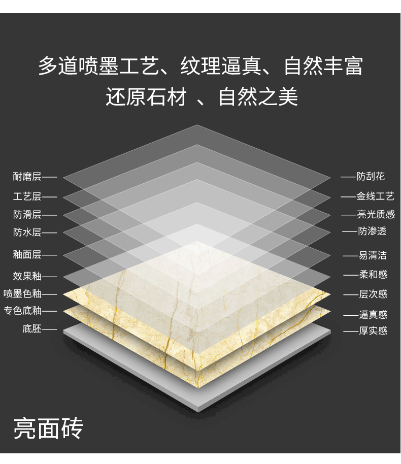 金線金粉 【產品介紹】航天級激光鍍金工藝,鉆石雕刻技術,高溫慢燒,釉層不吸污吸水率低,真空鍍金燒成后再進行真空電鍍工藝,平整如鏡面,精拋細磨,磚面平整光滑細膩光澤度、亮度、硬度較高。立體紋理,釉下彩工藝,三次淋釉增加磚面的立體感。