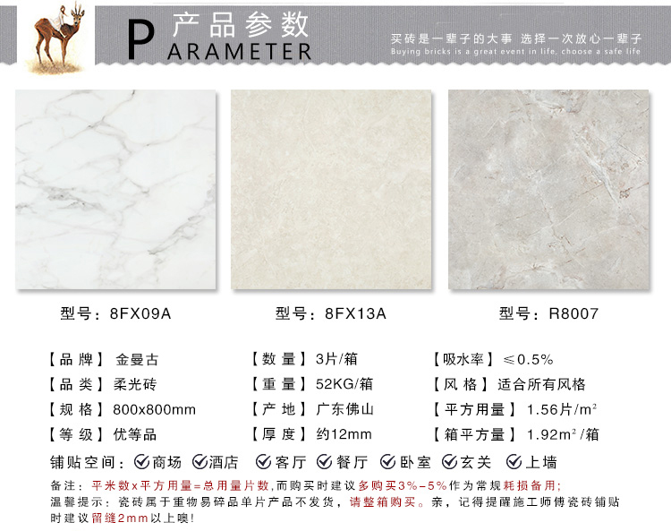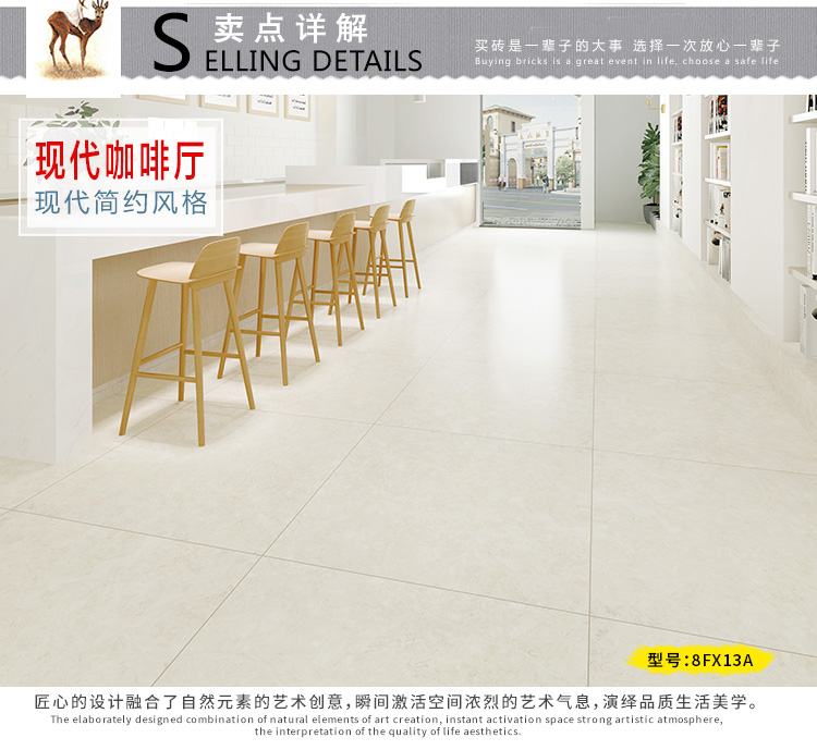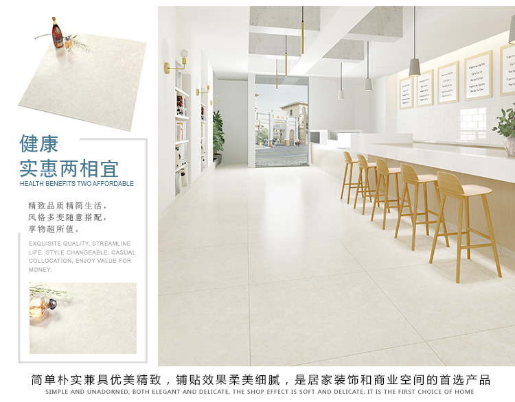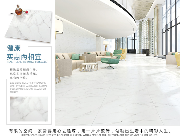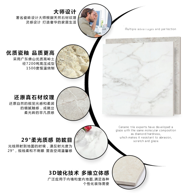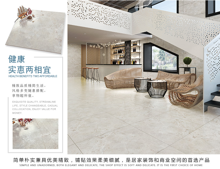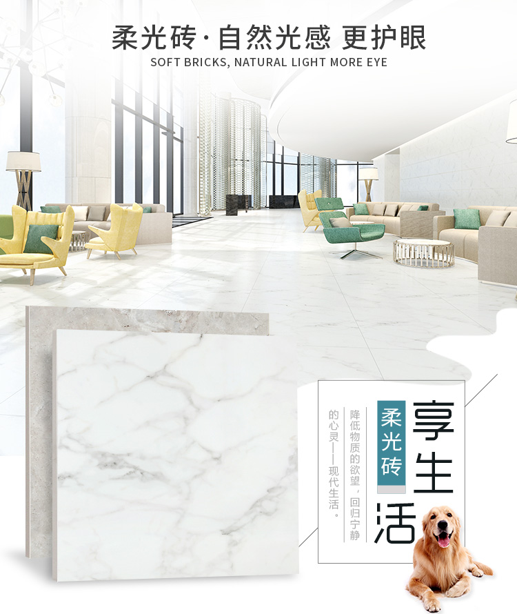 柔光瓷磚是磚面反射介于強光與弱光之間的一類瓷磚,其結合亮光類瓷磚的高調(diào)明艷裝飾和啞光類瓷磚的低調(diào)內(nèi)斂搭配效果,通過動態(tài)柔光蠟拋技術,降低產(chǎn)品反光率,從而達到人體舒適的視覺感受以及無光污染的空間裝飾效果。優(yōu)點:1.視覺舒適,無光污染 2.堅固耐磨,不易刮花.